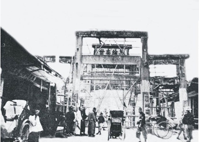 (此图网传是武林城门拆除时,但从“熙纶奕世”的匾额,三重门的结构,以及与两边紧靠的商店来看,这应该是一座牌坊,匾额的意思是“光明代代相传”。)