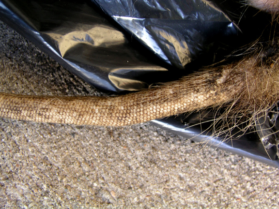 四天以后,我打开了那只关闭的垃圾桶,为那只死去的怪兽消毒后拍了照片,立案存档。尽管早已经有了心理准备,我还是为那野兽的丑恶模样吃惊:浑身都是稀疏的四、五吋灰白长毛,显得怪异;多肉的爪子按比例看相当大,特别强壮有力;尖嘴獠牙配着圆形的耳朵,一看就知道不是良善之辈;多肉粗壮的尾巴像根邪恶的鞭子;身体长度超过三尺,体重约四至五公斤。这种体型的动物一次咬死二十几只鸡,或者吞噬两只鸡完全胜任愉快。